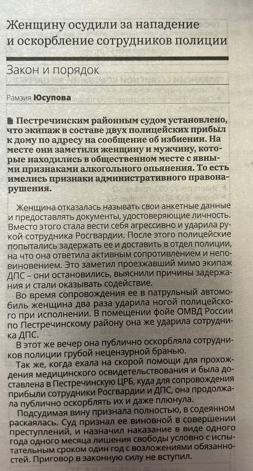 | В новом номере газеты "Вперед" опубликована статья секретаря судебного заседания Пестречинского районного суда Республики Татарстан Р.Ф. Юсуповой | версия для печати |