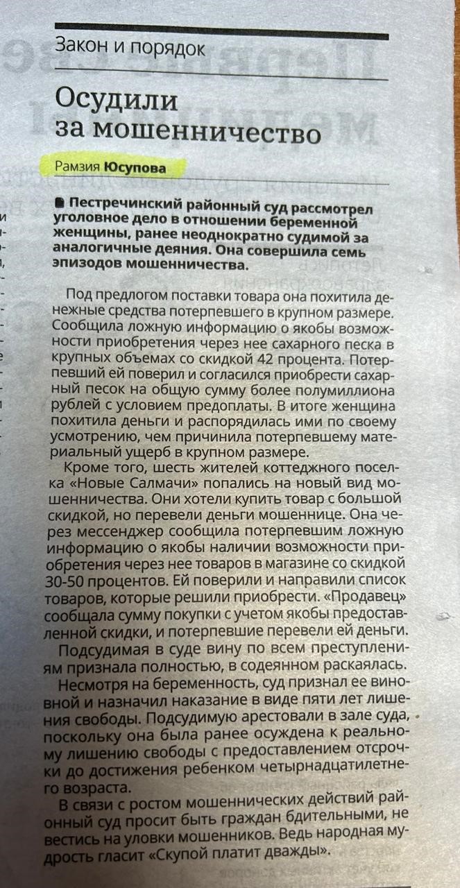 В новом номере газеты "Вперед" опубликована статья секретаря судебного заседания Пестречинского районного суда Республики Татарстан Р.Ф. Юсуповойверсия для печати